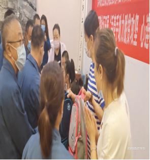 由支部黨員為小朋友發(fā)放愛心書包,并合影留念。