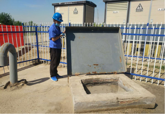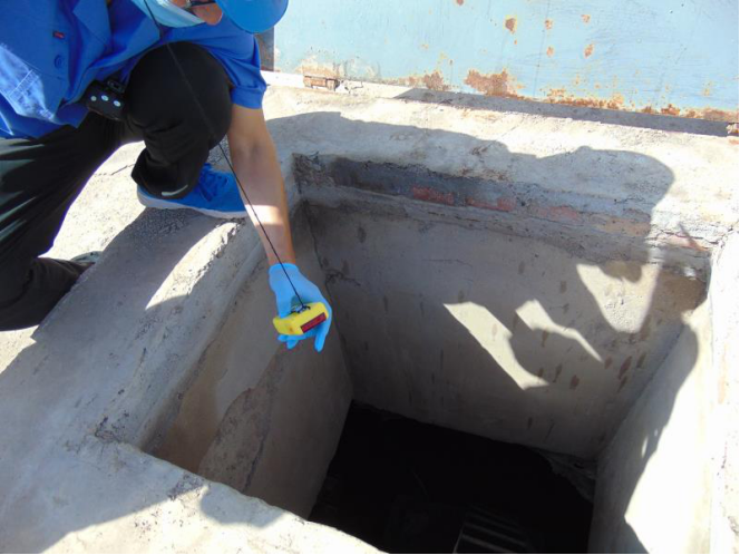 五、采樣。到達采樣地點,由采樣員王連柱、葛帥按規(guī)定將井蓋打開,通風5分鐘,使用空氣檢測儀對井下空氣進行測量,無異常后,佩戴安全帽,進入井內(nèi),連接水管排水20分鐘后按要求進行采樣。