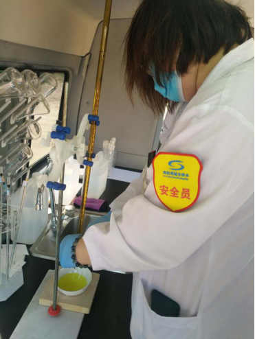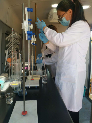 六、現(xiàn)場檢測。水質(zhì)檢測中心14名檢測人員分別對現(xiàn)場采集的水樣進行檢測,檢測項目有:色度、肉眼可見物、臭和味、渾濁度、pH、電導率、總硬度、氯化物、游離余氯,并填寫原始記錄。