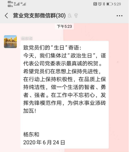 烏海市海勃灣城市供水有限公司為進(jìn)一步增強(qiáng)主題教育的吸引力和感染力,于6月24日開展黨員“過政治生日,憶入黨初心”主題黨日活動(dòng)。五個(gè)黨支部分別在完成奏唱國(guó)歌、重溫入黨誓詞、領(lǐng)誦黨章、繳納黨費(fèi)、學(xué)習(xí)政治理論后為黨員過“政治生日”。