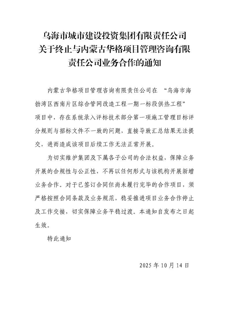 烏海市城市建設(shè)投資集團有限責(zé)任公司關(guān)于終止與內(nèi)蒙古華格項目管理咨詢有限責(zé)任公司業(yè)務(wù)合作的通知