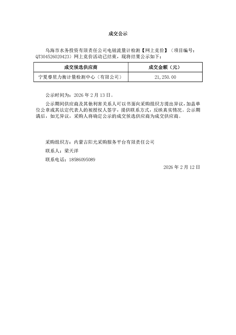烏海市水務(wù)投資有限責(zé)任公司電磁流量計(jì)檢測【網(wǎng)上競價】結(jié)果公示